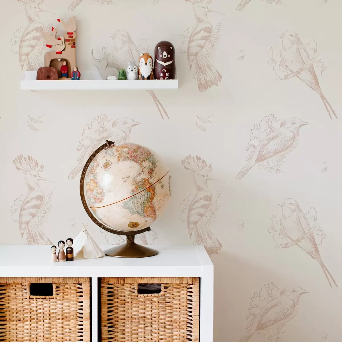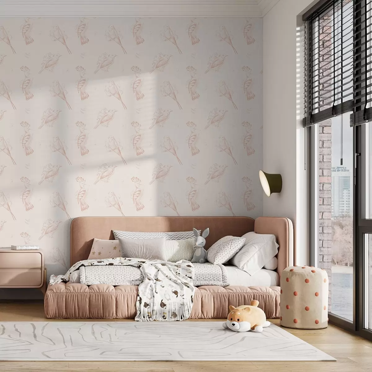 Papel tapiz Toile de pájaros: bocetos de pájaros sobre fondo color melocotón-crema. Nr. a00656v2