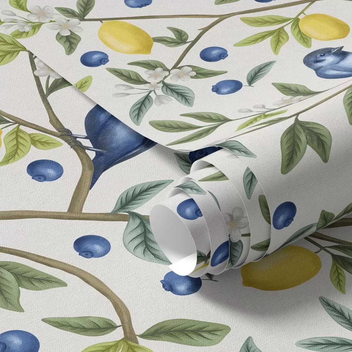 Papel tapiz Pájaros azules, limones y bayas sobre fondo blanco Nr. a00668