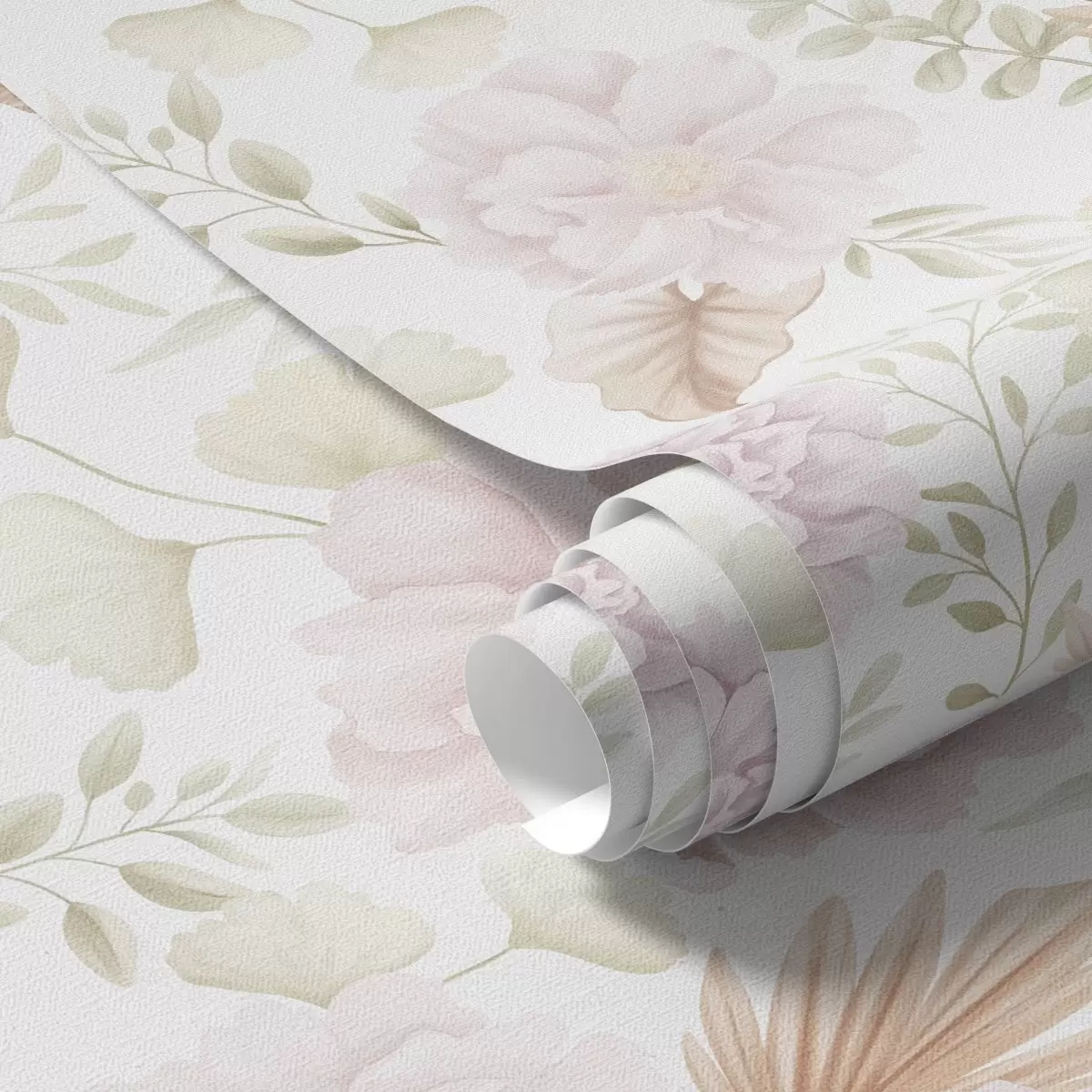Papel tapiz Suaves peonías en tonos pastel y follaje sobre fondo blanco Nr. a00669