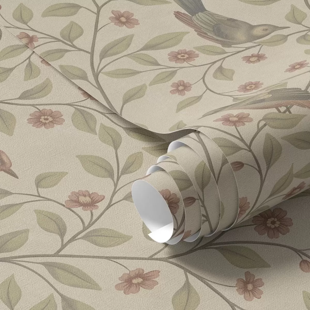 Papel pintado Pájaros en ramas florecidas, fondo beige cálido a00670