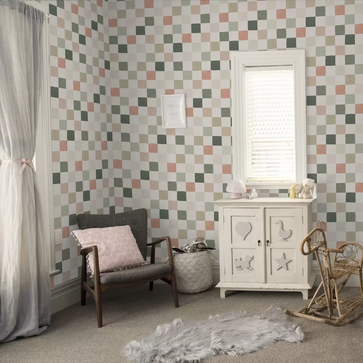 Papel pintado Suave manta a cuadros en tonos verde pastel, rosa y beige a00676