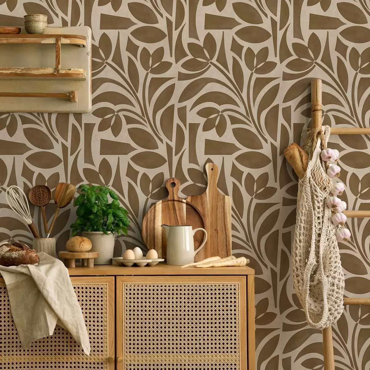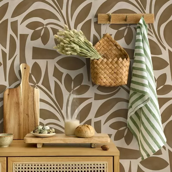 Papel pintado Siluetas geométricas de hojas, marrón caramelo sobre beige a00679