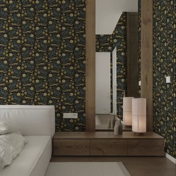Papel tapiz Pájaros, lagartos y caracoles entre flores sobre un fondo oscuro Nr. a00691