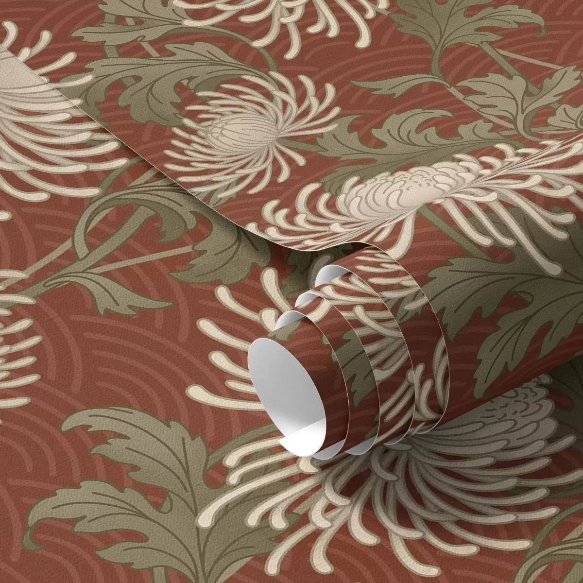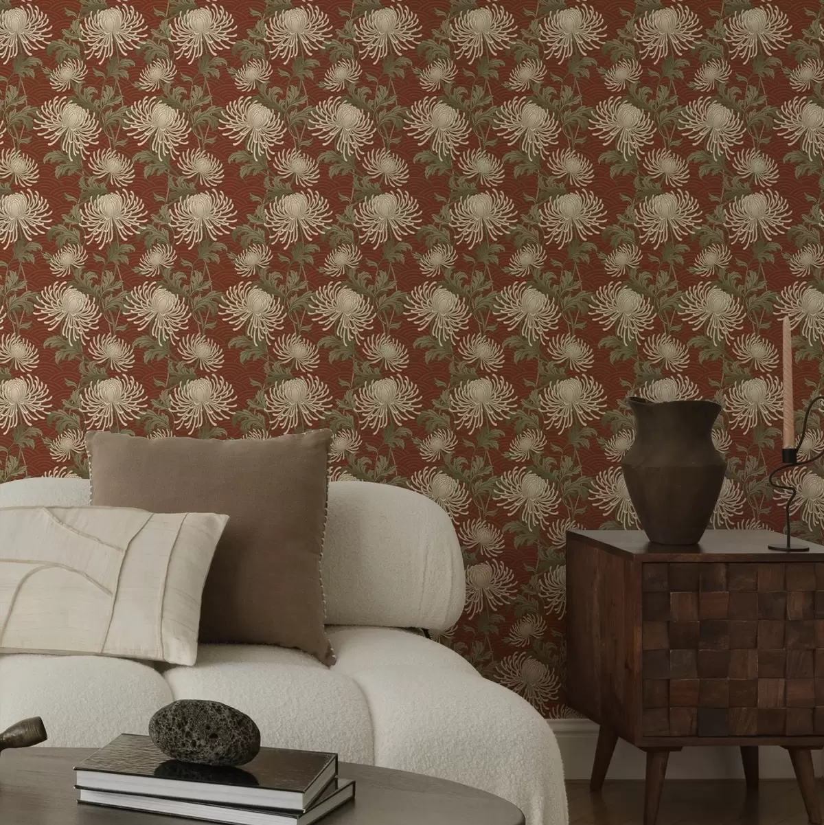 Papel tapiz Crisantemos color crema sobre fondo terracota, estilo asiático Nr. a00693