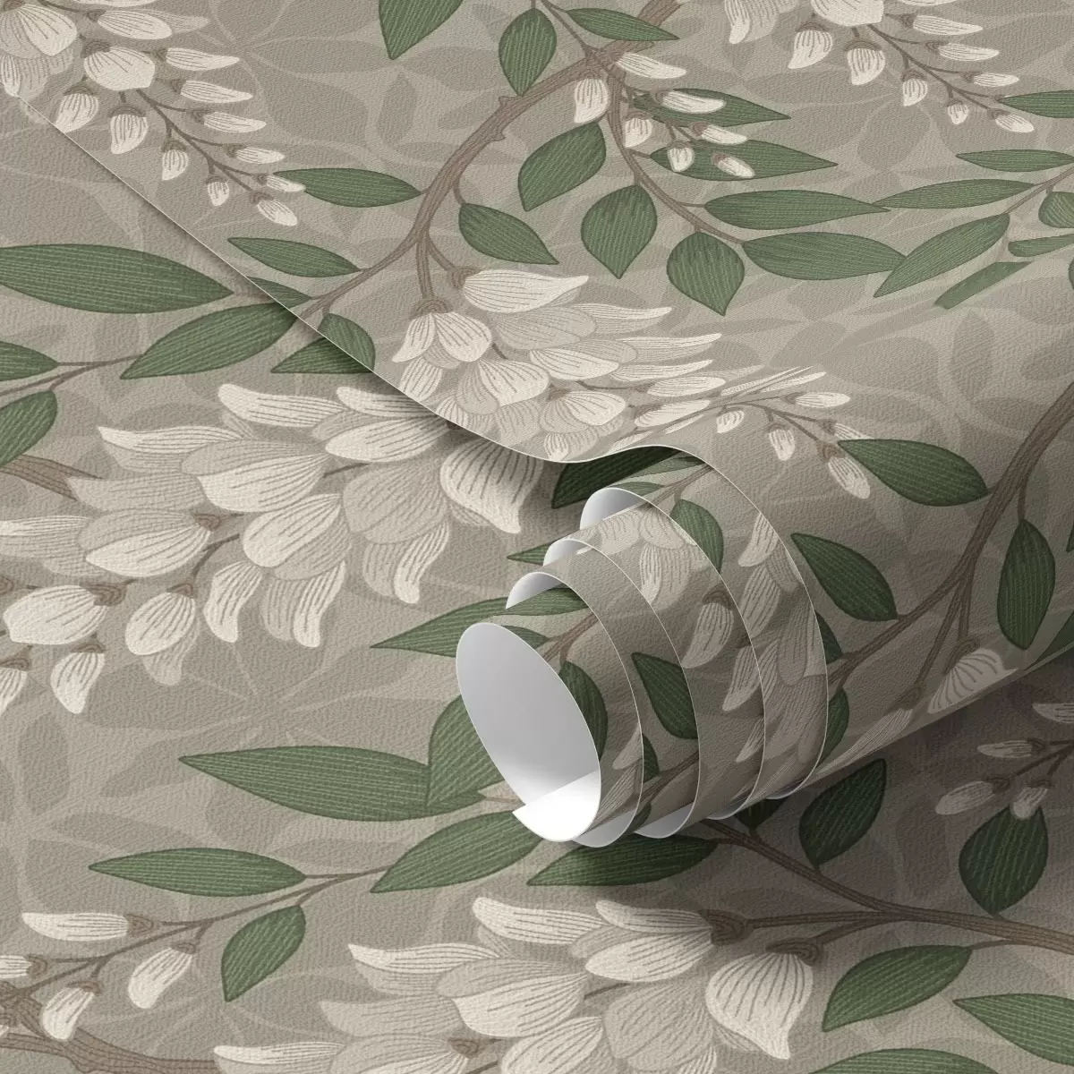 Papel tapiz Glicinia clara sobre fondo gris oliva, racimos en cascada Nr. a00694