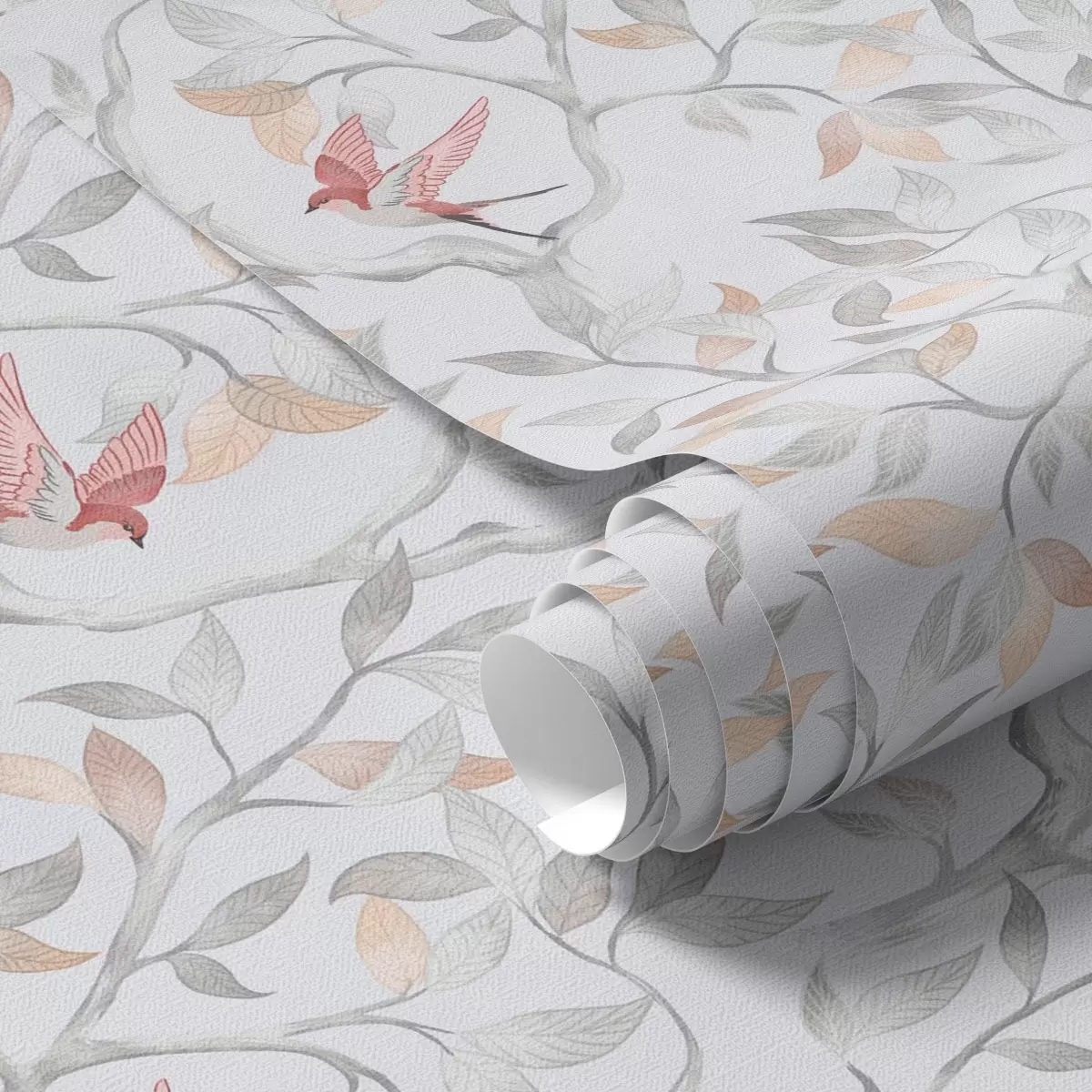Papel tapiz Ramas ligeras con hojas y pájaros en tonos melocotón Nr. a00716