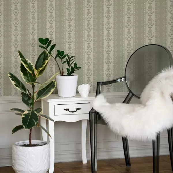 Papel tapiz Adorno rayado con columnas florales en tonos salvia Nr. a00719