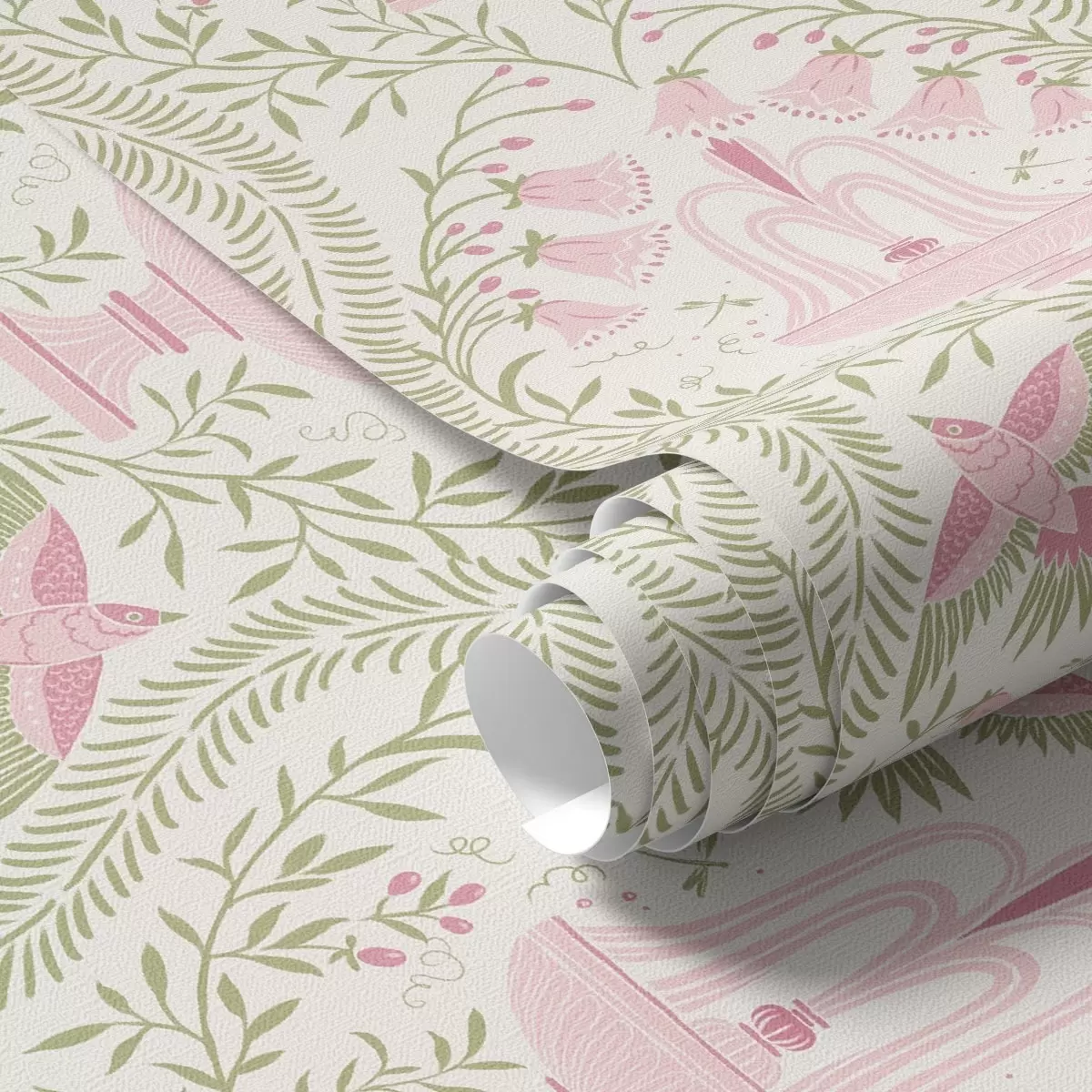 Papel tapiz Fuentes, colibríes y volutas verdes sobre fondo claro Nr. a00723