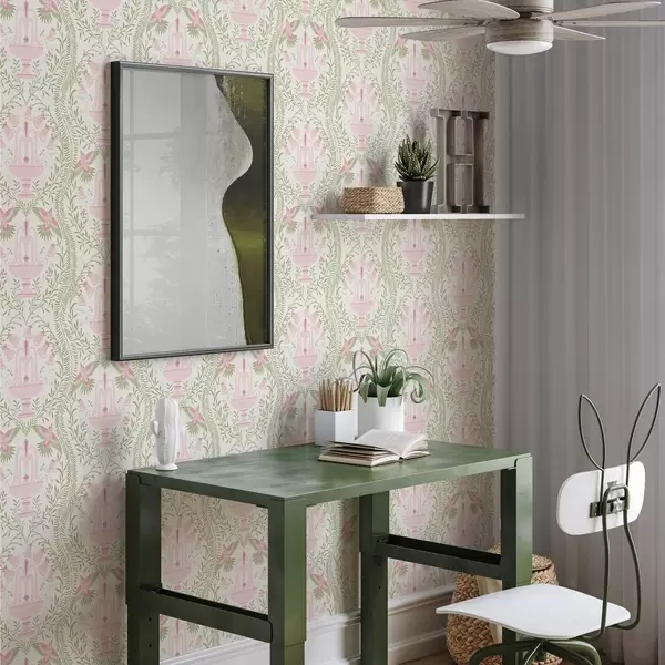Papel tapiz Fuentes, colibríes y volutas verdes sobre fondo claro Nr. a00723