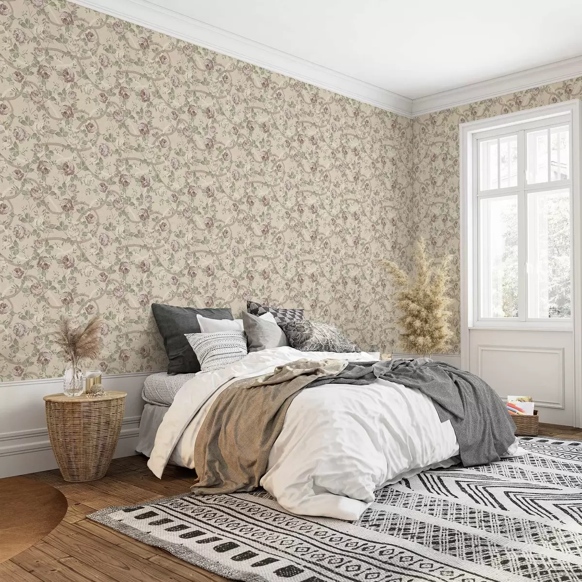 Papel tapiz Rosas con hojas verdes sobre un fondo beige cálido Nr. a00729