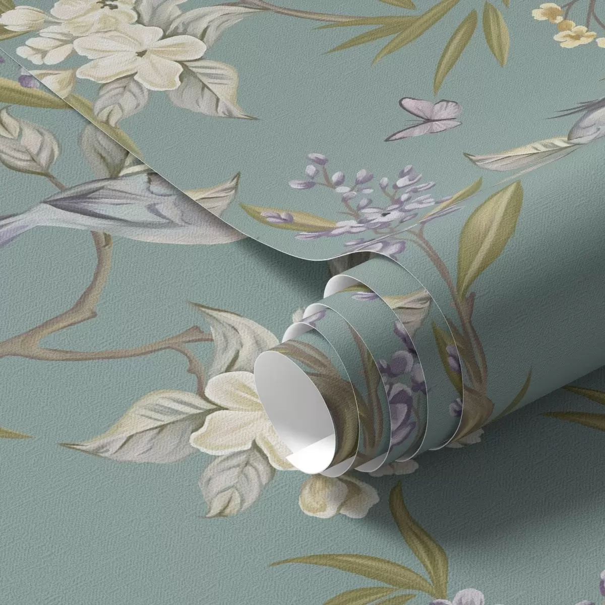 Papel tapiz Pájaros, flores y mariposas sobre un fondo azul grisáceo. Nr. a00735