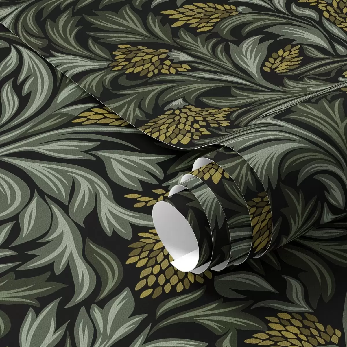 Papel tapiz Hojas de acanto oscuras con conos dorados sobre fondo negro Nr. a00745