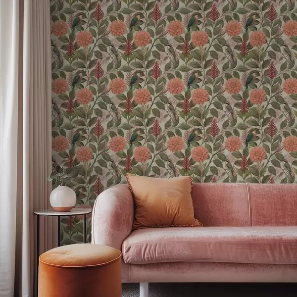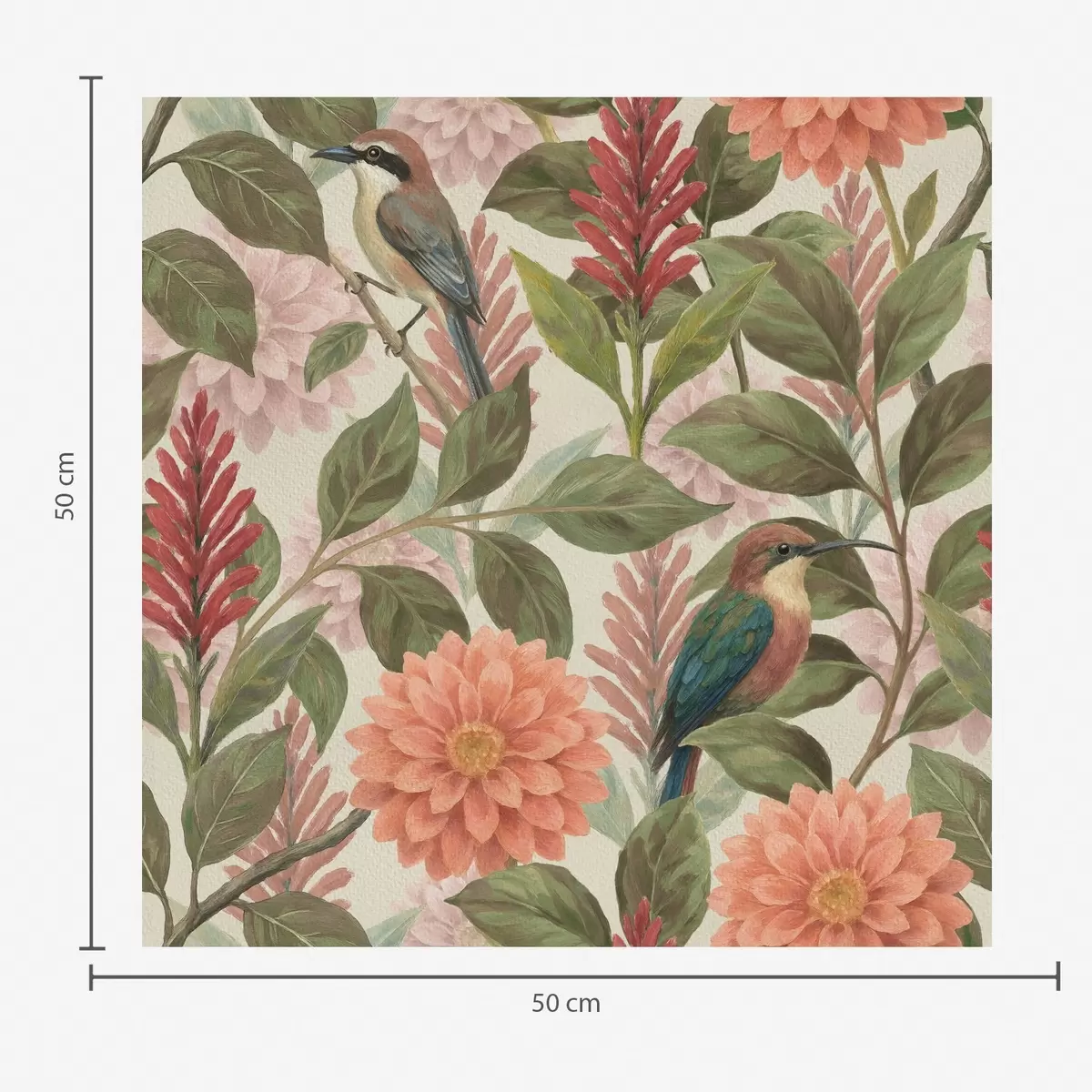 Papel tapiz Pájaros entre flores y hojas en tonos cálidos Nr. a00753