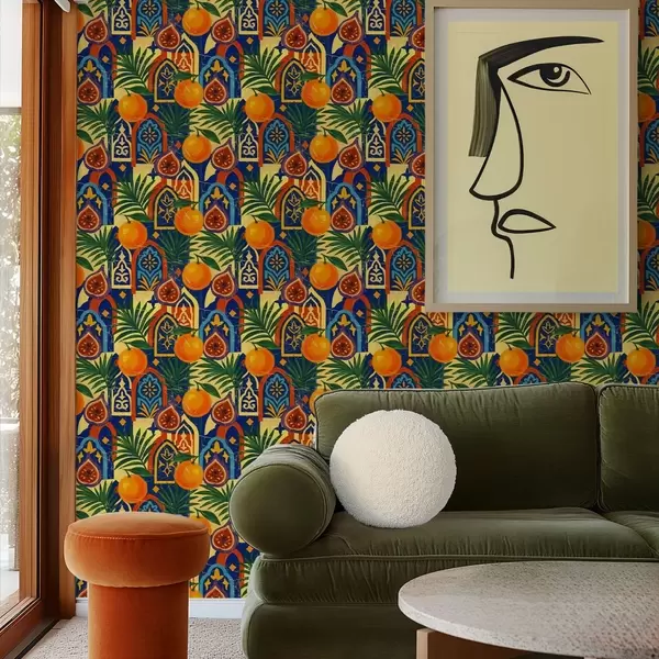Papel tapiz Naranjas brillantes, hojas de palmera y arcos marroquíes Nr. a00767