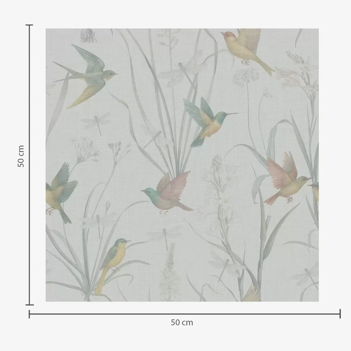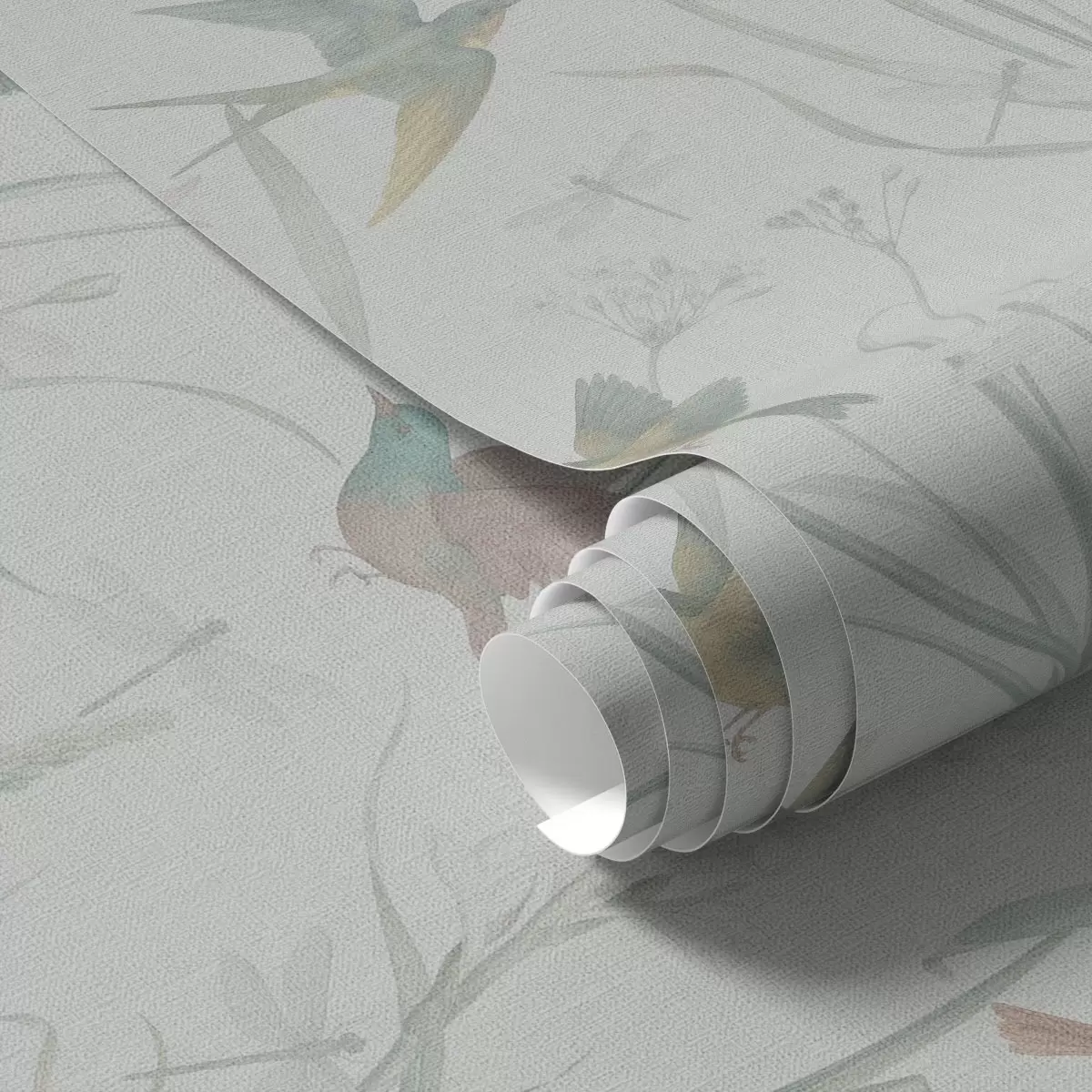 Papel tapiz Pájaros entre la hierba del prado sobre un fondo gris claro. Nr. a00776v1