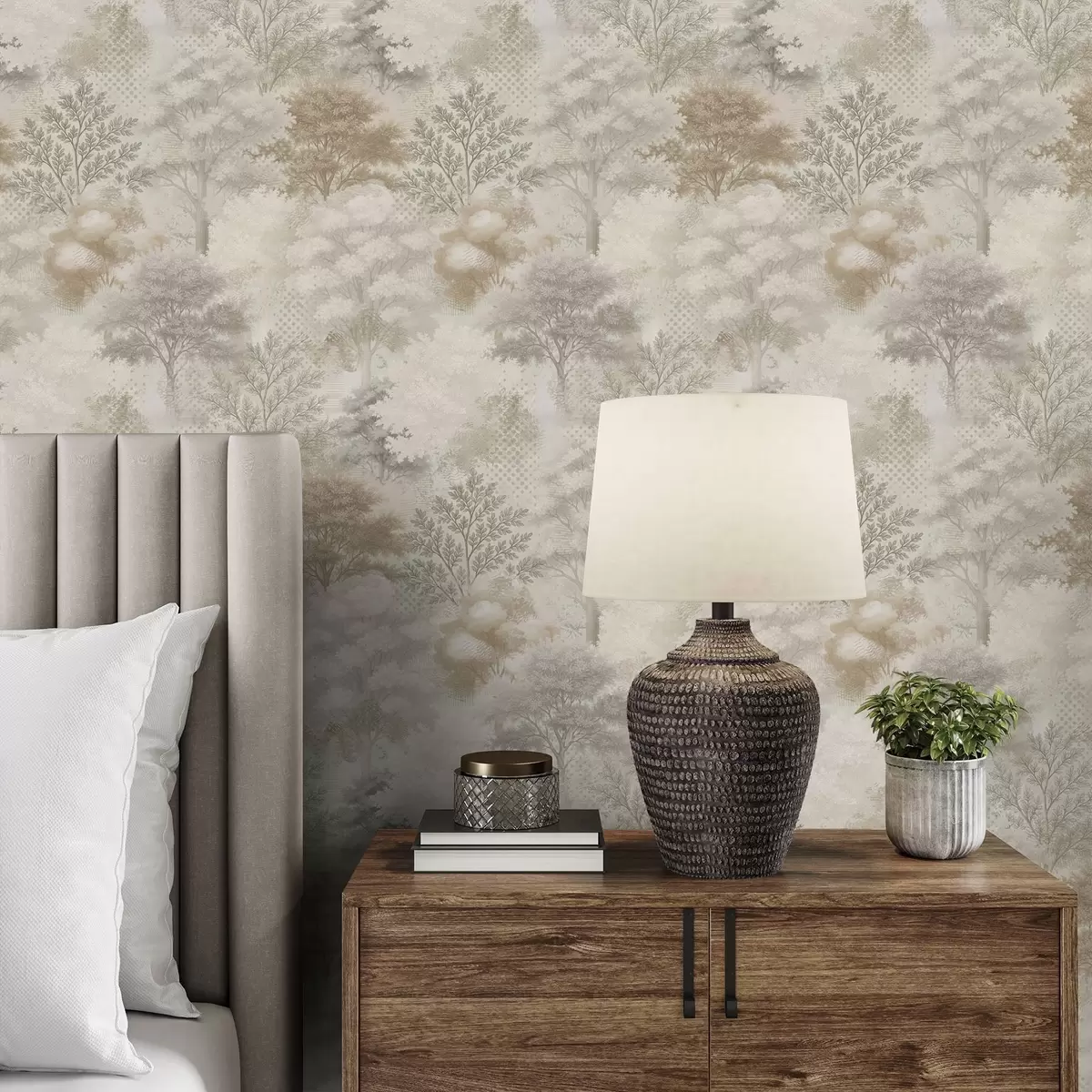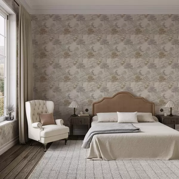 Papel tapiz Bosque apacible envuelto en niebla, suaves tonos beige y grisáceos. Nr. a00785