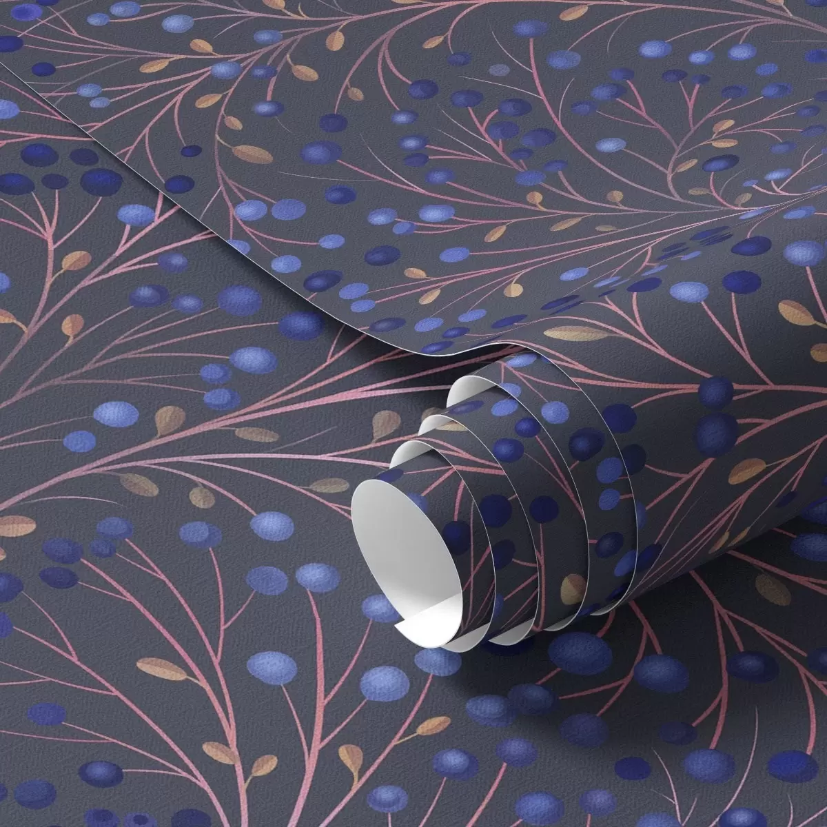 Papel tapiz Ramitas de color rosa-marrón y bayas azules sobre fondo grafito Nr. a00787