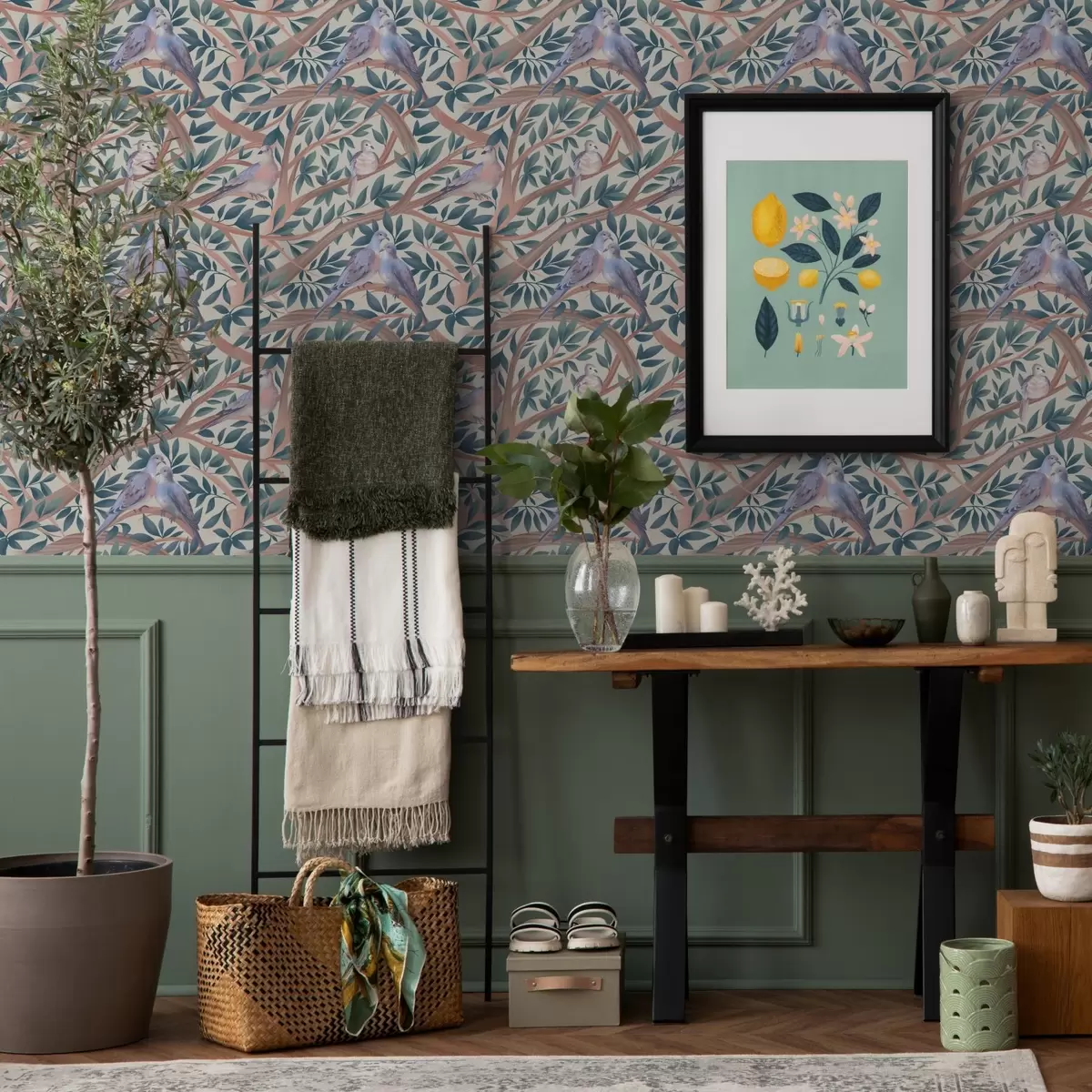 Papel tapiz Palomas entre ramas y hojas en una suave paleta de colores pastel Nr. a00796