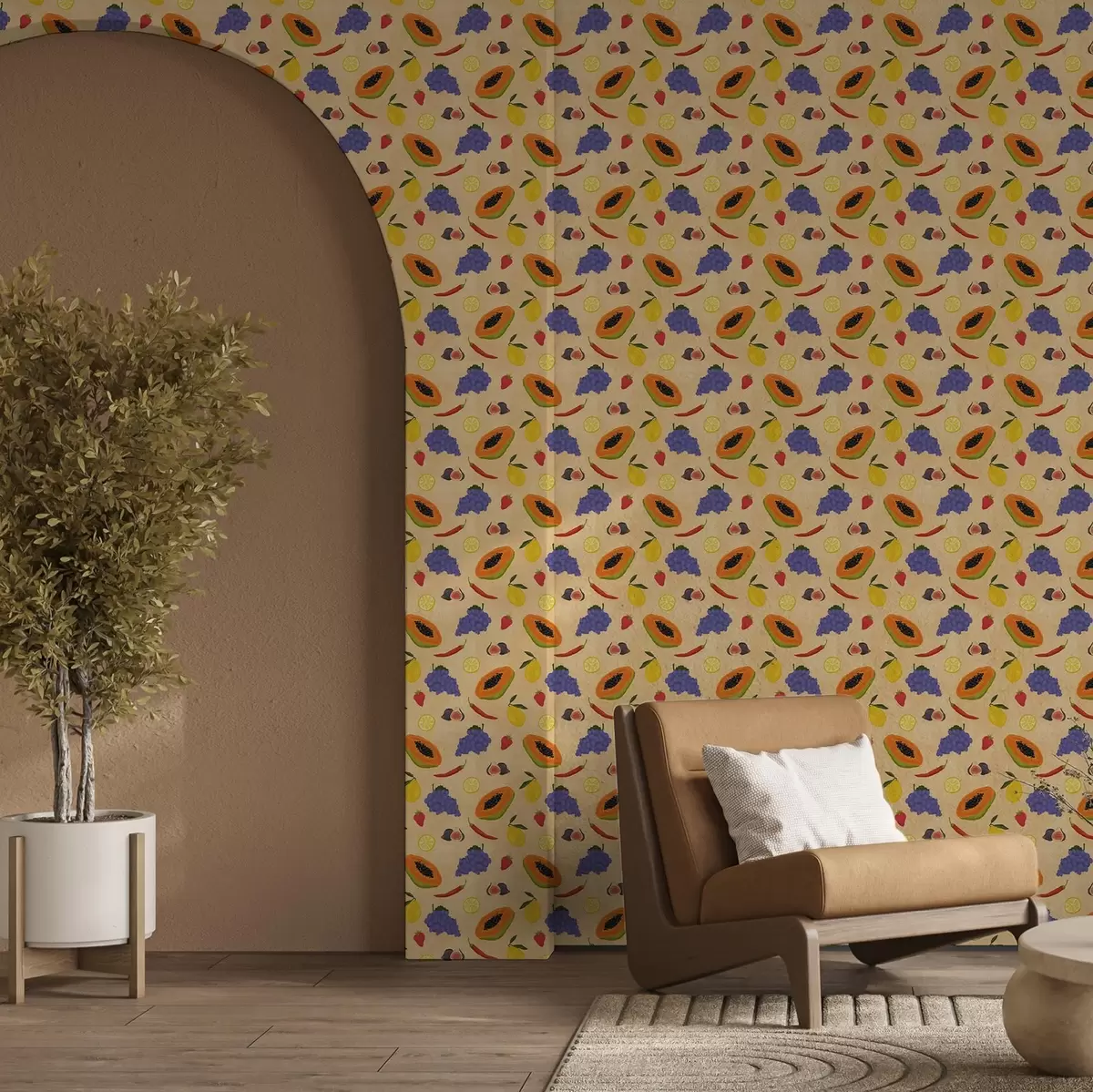 Papel tapiz Papaya, cítricos y bayas sobre un fondo cálido y rico Nr. a00803v1