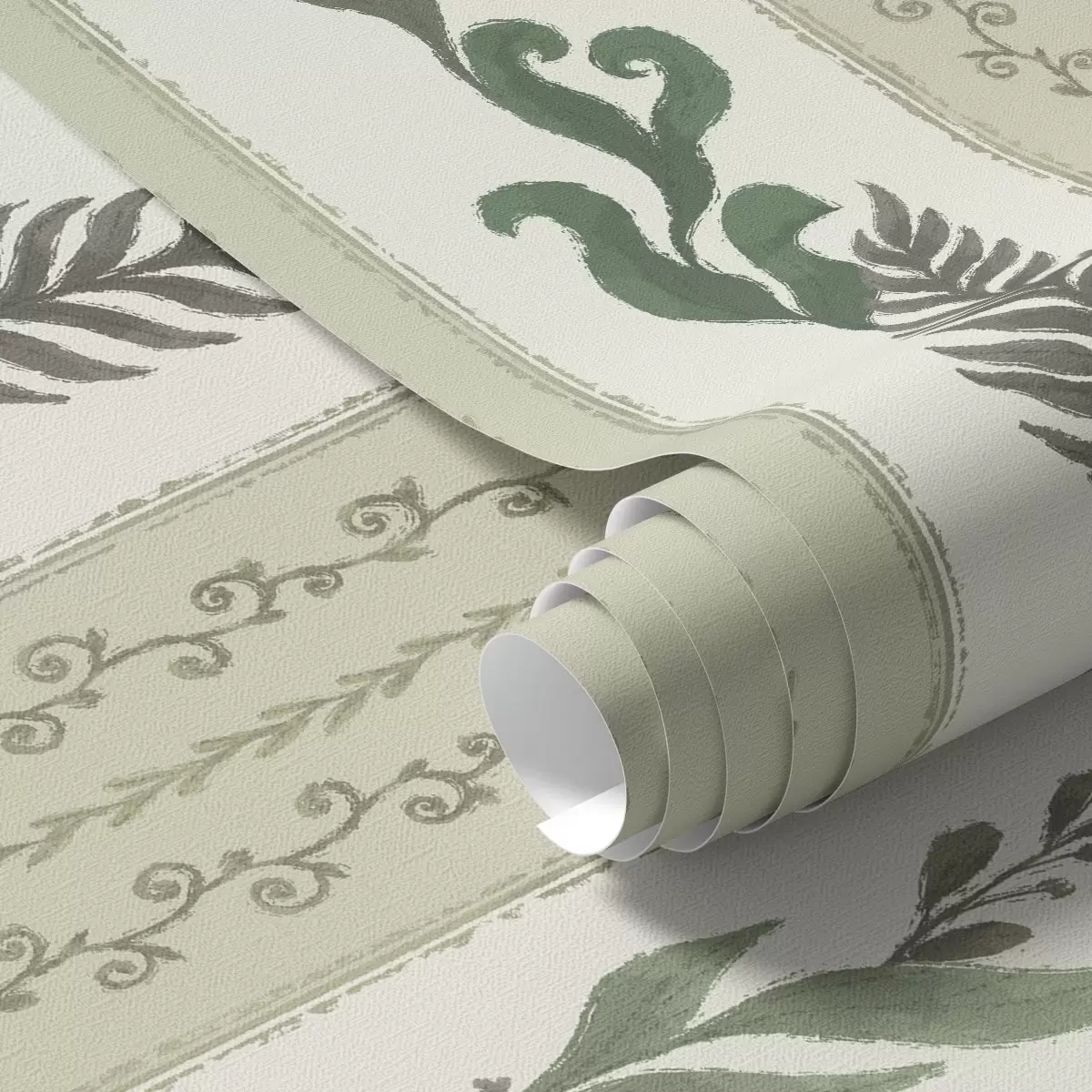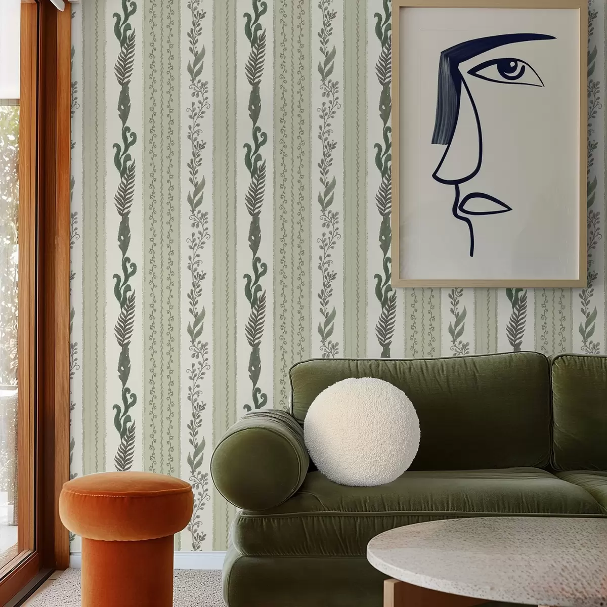 Papel pintado Rayas con ramificaciones en tonos verdes y grises, contraste suave a00824