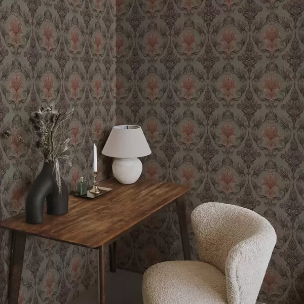 Papel tapiz Damasco terracota sobre fondo oliva apagado Nr. a00828v3
