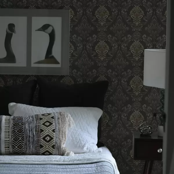 Papel tapiz Damasco sobre fondo grafito oscuro, detalles en ocre oliva. Nr. a00828v5