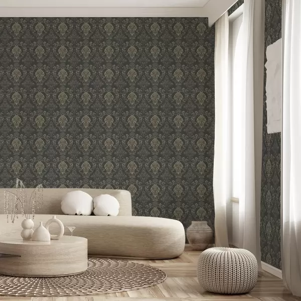 Papel tapiz Damasco sobre fondo grafito oscuro, detalles en ocre oliva Nr. a00828v5