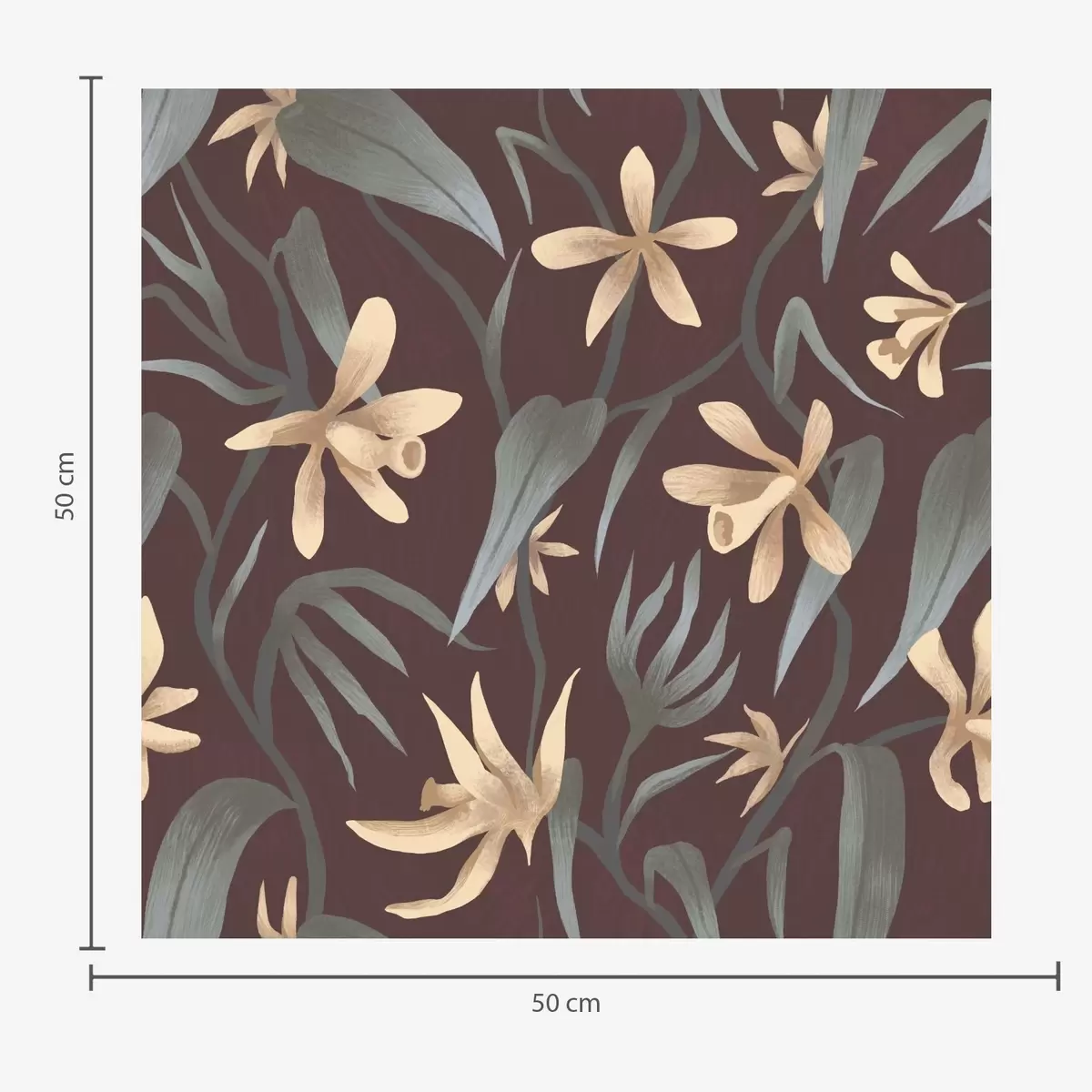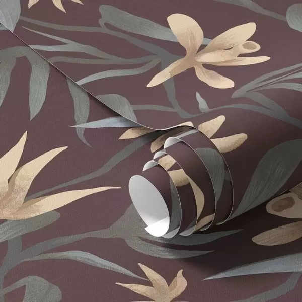Papel tapiz Flores color crema con hojas grises sobre fondo burdeos. Nr. a00833