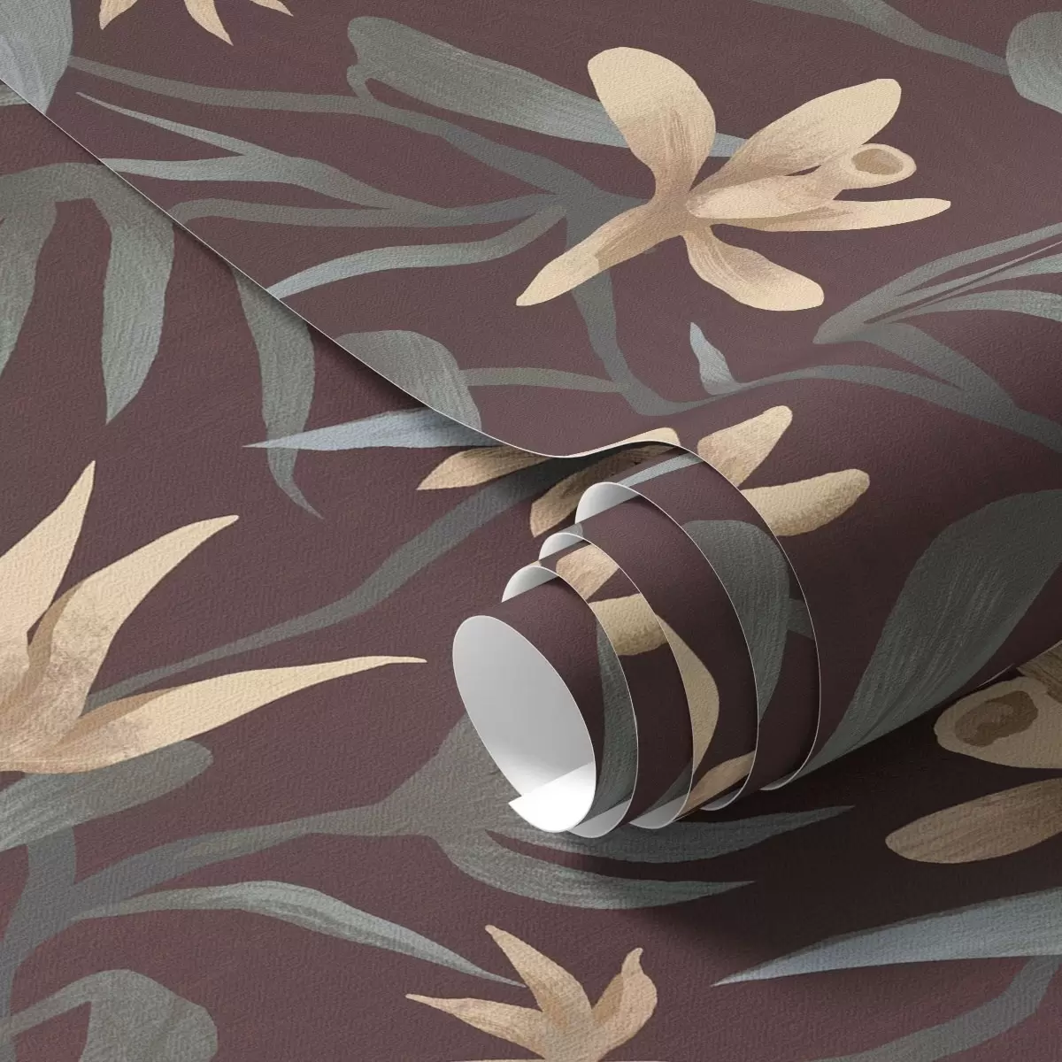 Papel tapiz Flores color crema con hojas grises sobre fondo burdeos. Nr. a00833