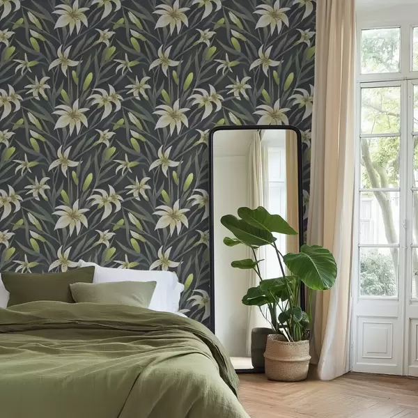 Papel pintado Lirios crema con hojas sobre fondo oscuro a00837v1