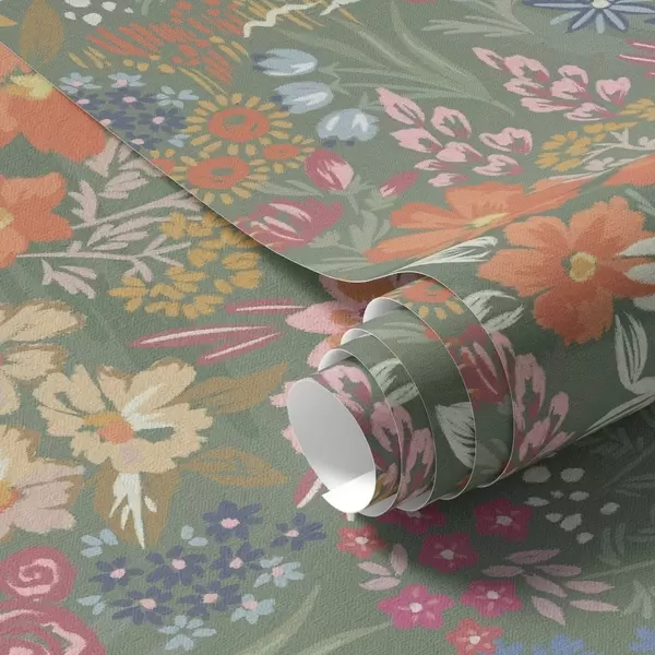 Papel tapiz Flores campestres pintadas sobre fondo verde salvia Nr. a00864