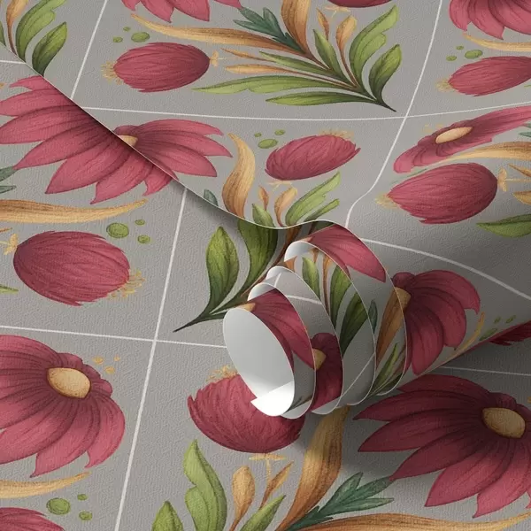 Papel tapiz Adorno floral simétrico sobre fondo gris con diagonales Nr. a00869