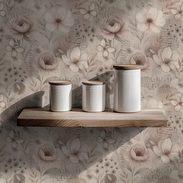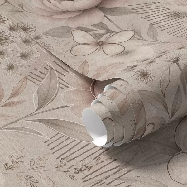 Papel tapiz Estampado floral en tonos beige sepia con detalles lineales y mariposas. Nr. a00870