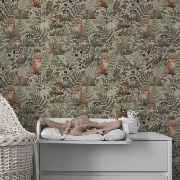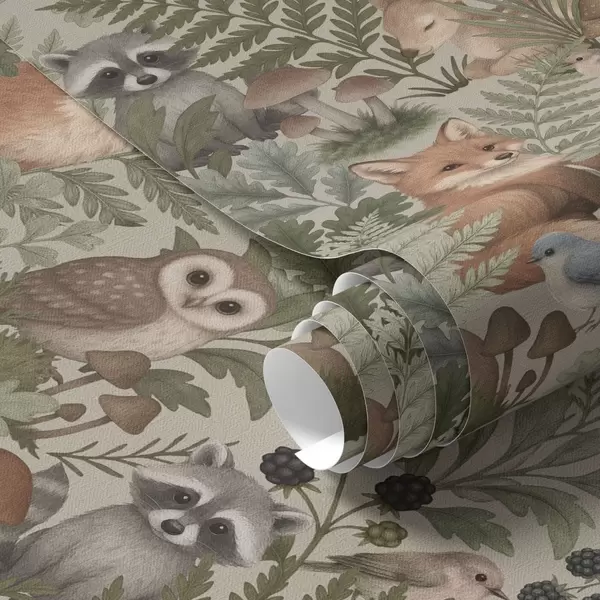 Papel tapiz Animales del bosque, helechos y setas sobre fondo beige claro. Nr. a00880v1