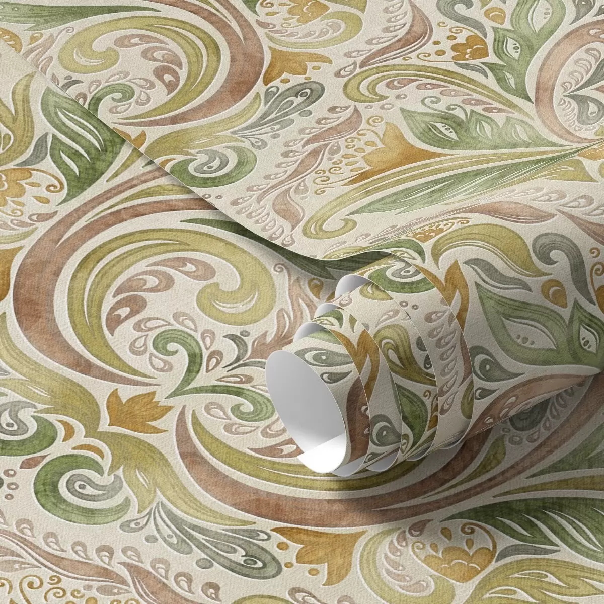 Papel tapiz Remolinos de hojas en acuarela en tonos verdes y ocres cálidos. Nr. a00927