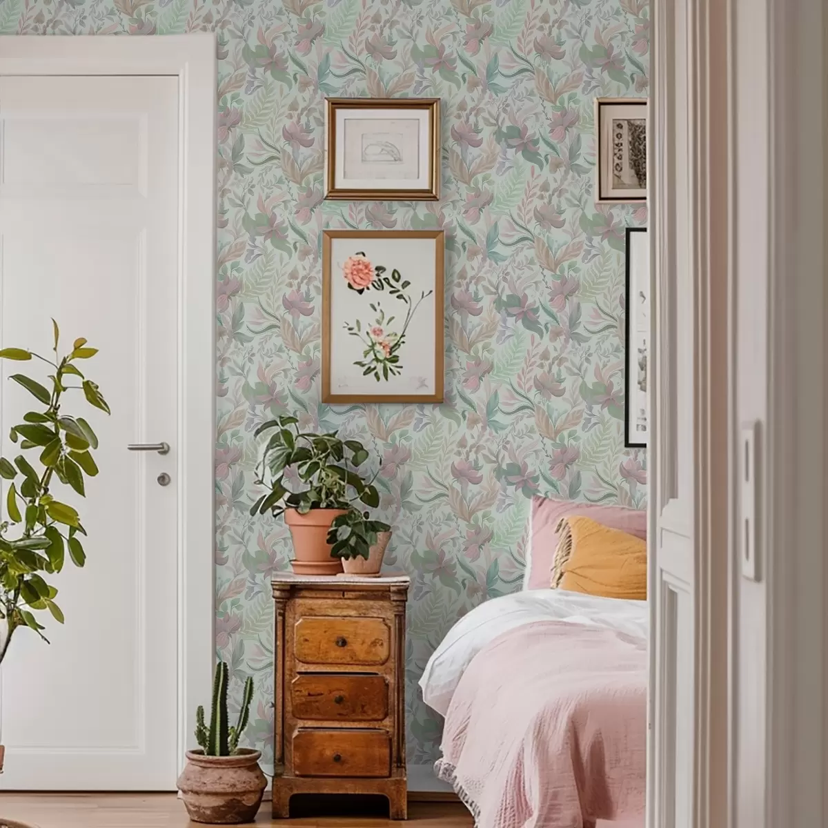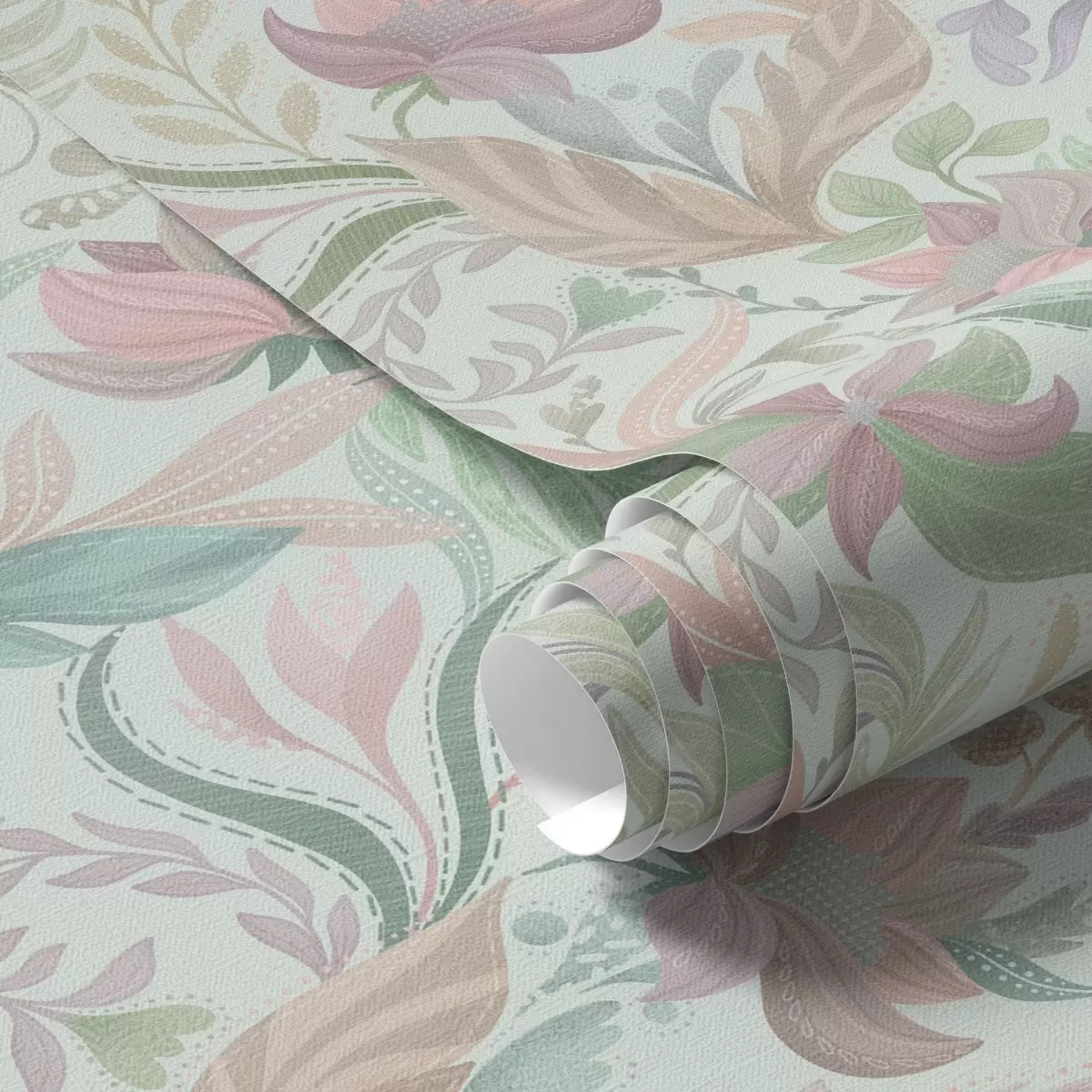 Papel tapiz Estampados florales en tonos pastel sobre un suave fondo menta. Nr. a00931v1
