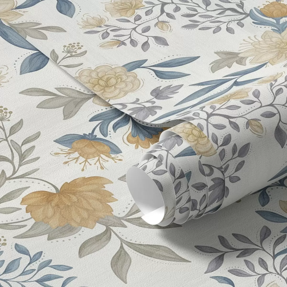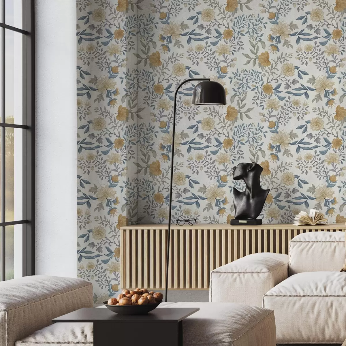 Papel tapiz Flores amarillas y vegetación azul sobre un fondo blanco lechoso. Nr. a00934v2