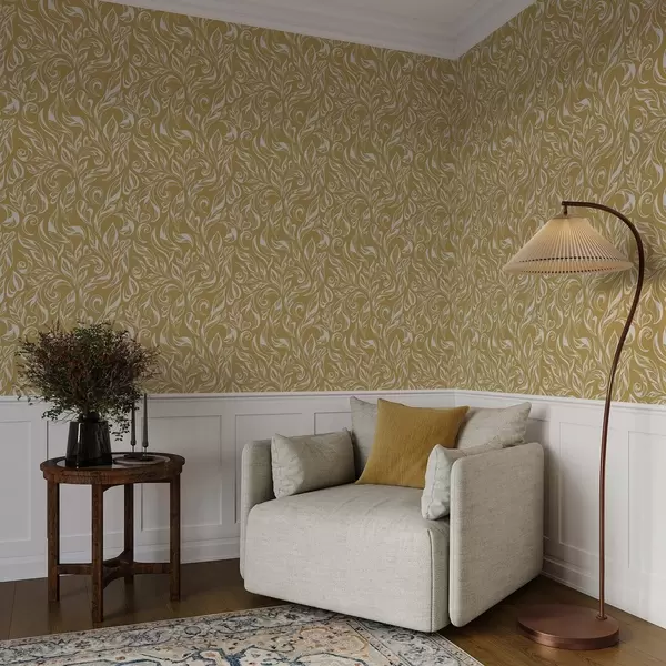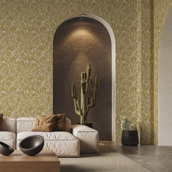 Papel pintado Adorno foliado de color blanco crema sobre un fondo ocre cálido a00940v1