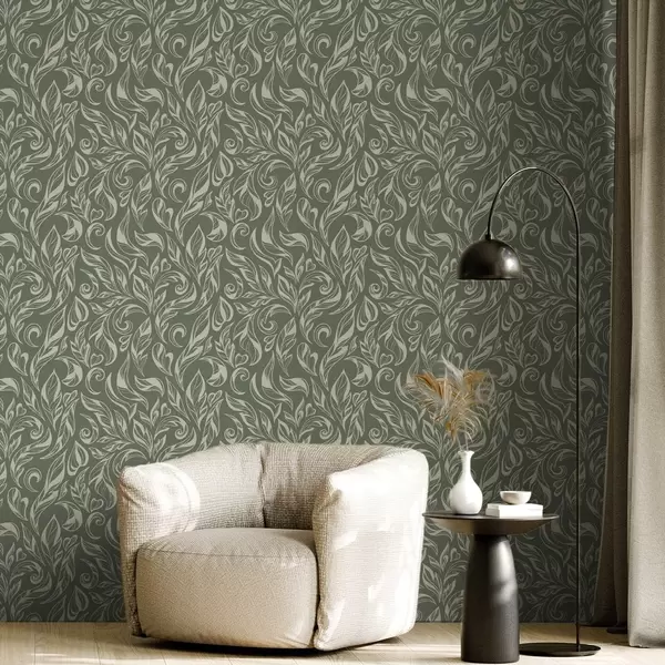 Papel tapiz Adorno de hojas color crema sobre fondo gris verdoso Nr. a00940v2