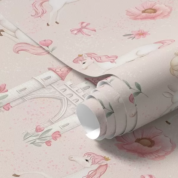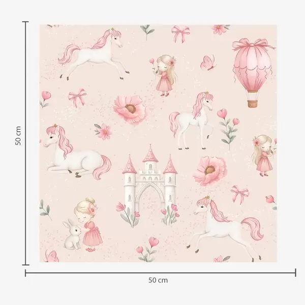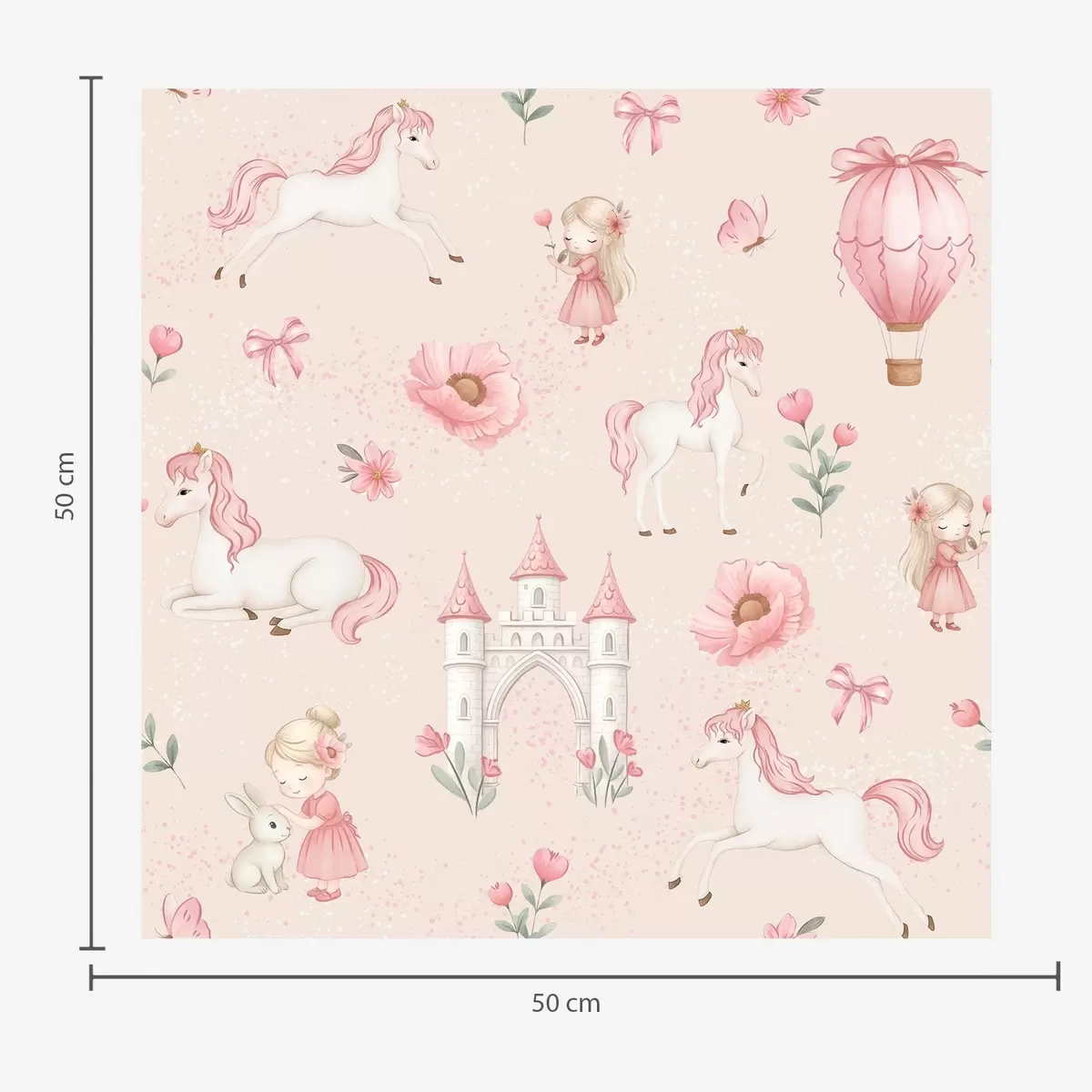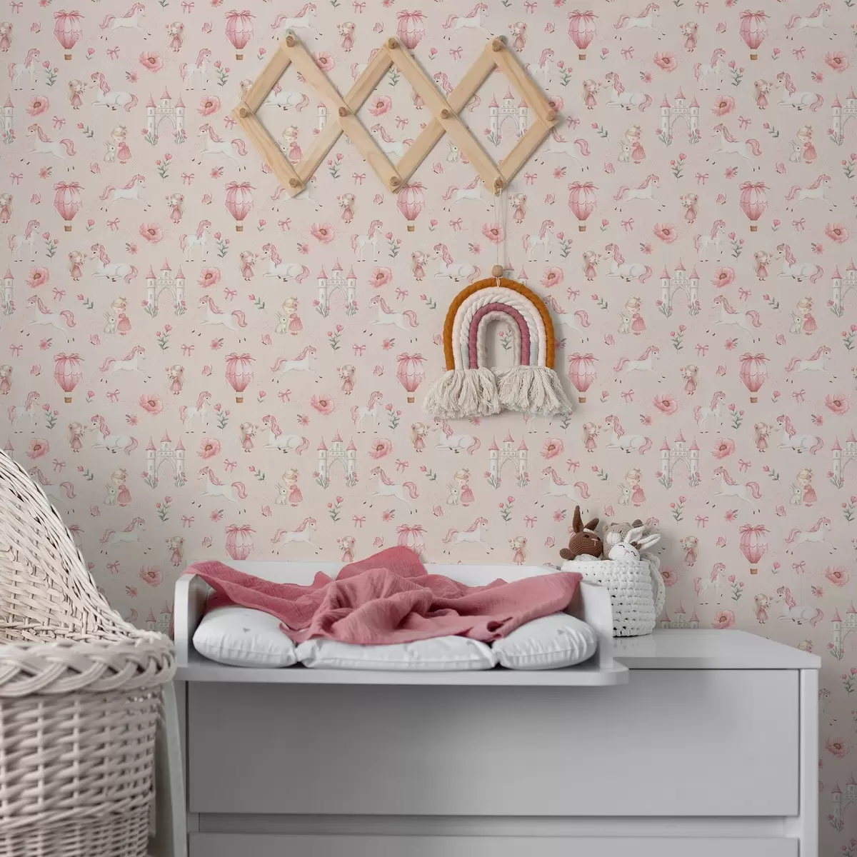 Papel tapiz Unicornios rosas, niñas pequeñas y un castillo sobre un fondo suave. Nr. a00957