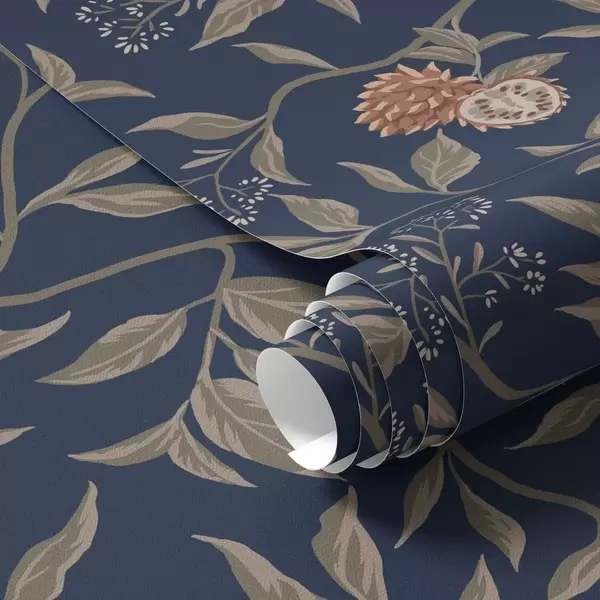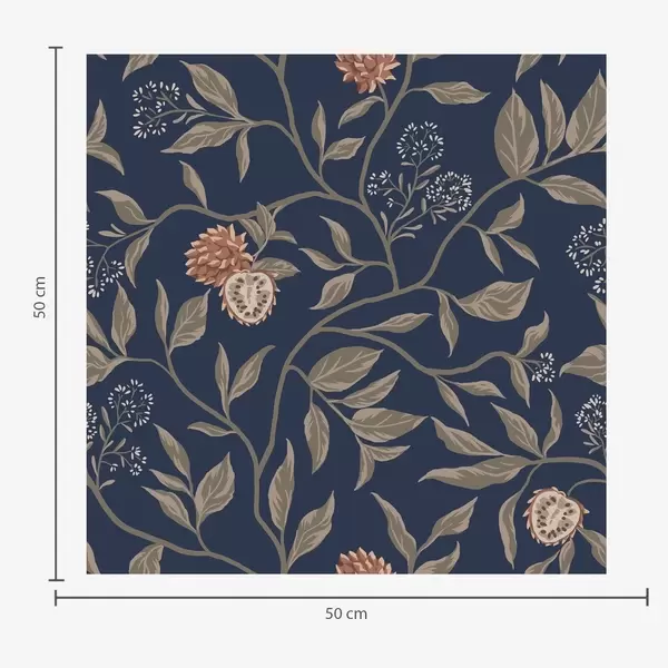 Papel tapiz Jardín azul con ramas, frutos y pequeñas flores. Nr. a00959