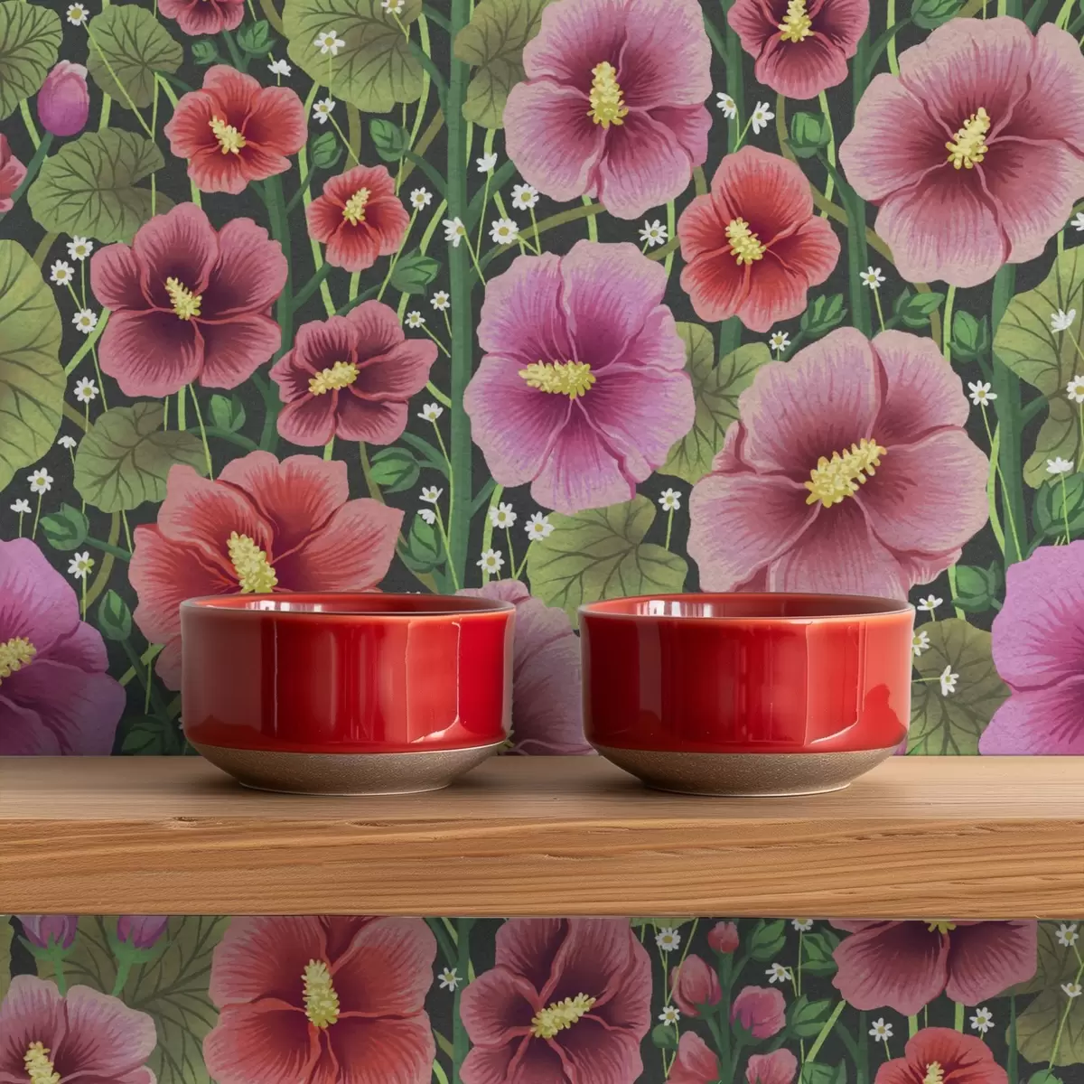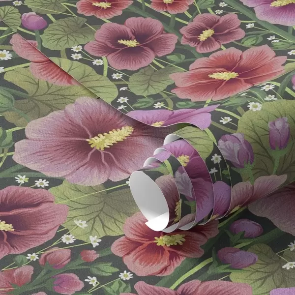 Papel tapiz Flores de hibisco brillantes y vegetación sobre un fondo oscuro. Nr. a00993v2