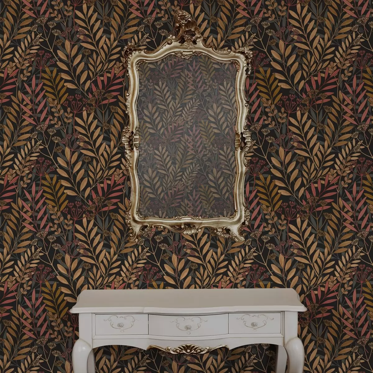 Papel tapiz Prado oscuro con hojas estilizadas y vainas de semillas Nr. a01020