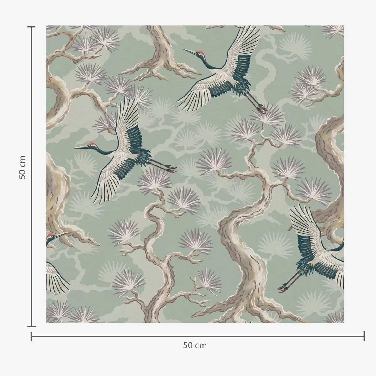 Papel tapiz Grullas entre ramas curvadas sobre un suave fondo color salvia. Nr. a01023
