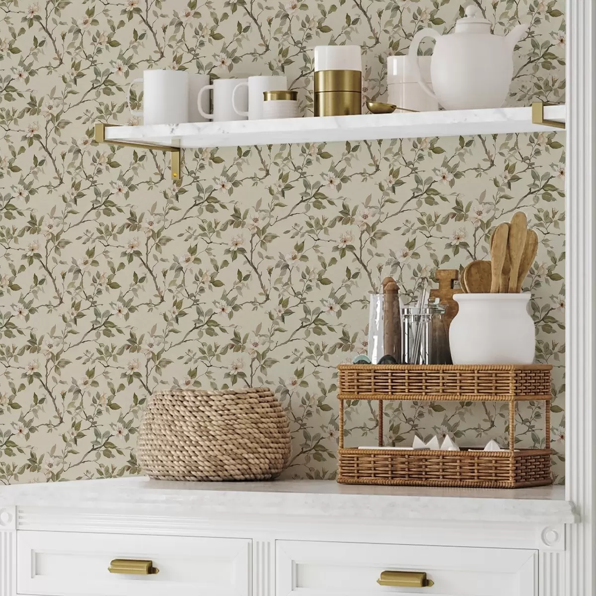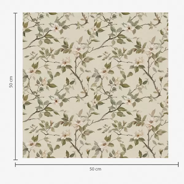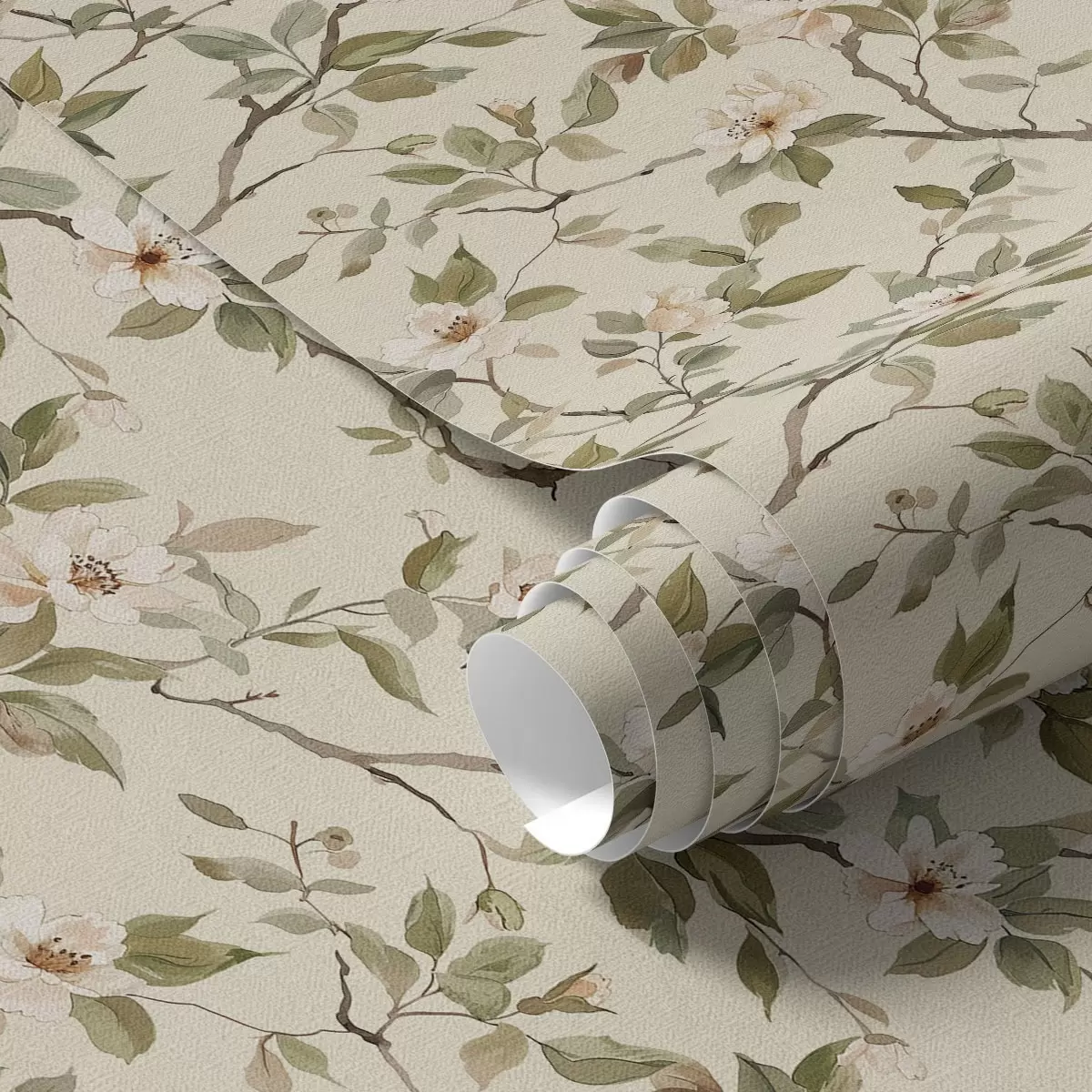 Papel tapiz Ramas ligeras con pequeñas flores color crema y hojas verdes. Nr. a01028