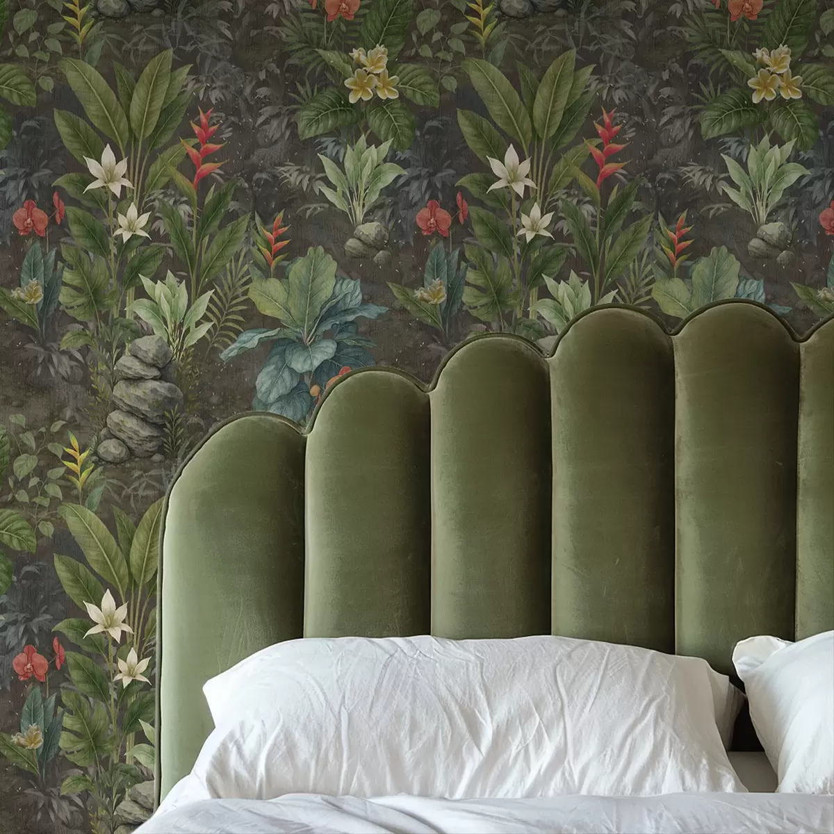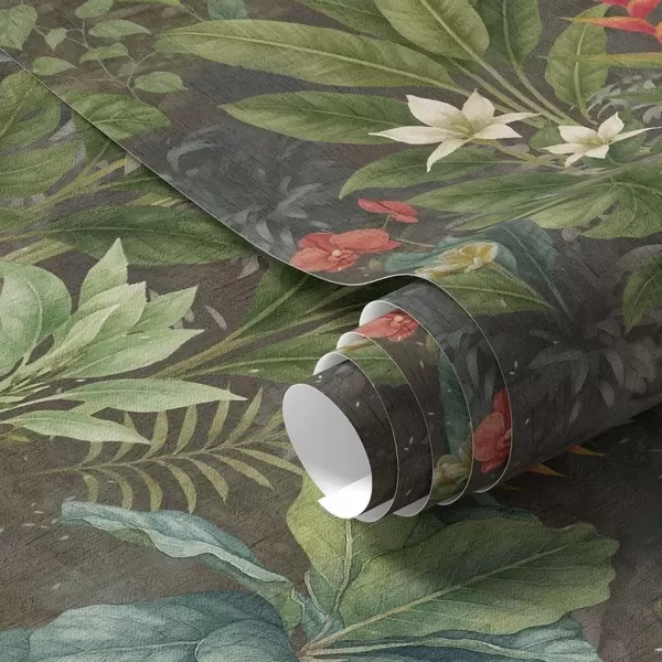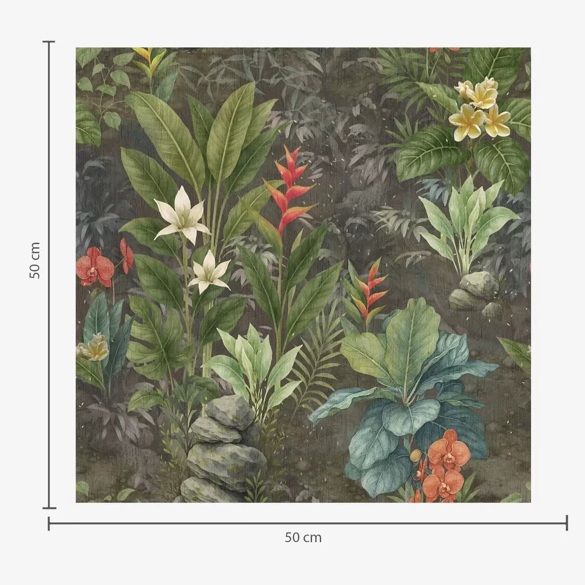 Papel tapiz Jardín tropical oscuro con flores y follaje brillantes. Nr. a01079