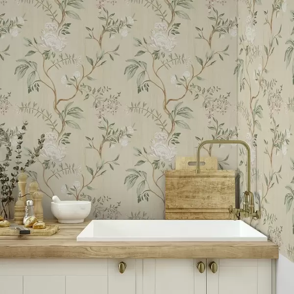 Papel tapiz Delicadas ramas con flores sobre un cálido fondo color crema Nr. a01084