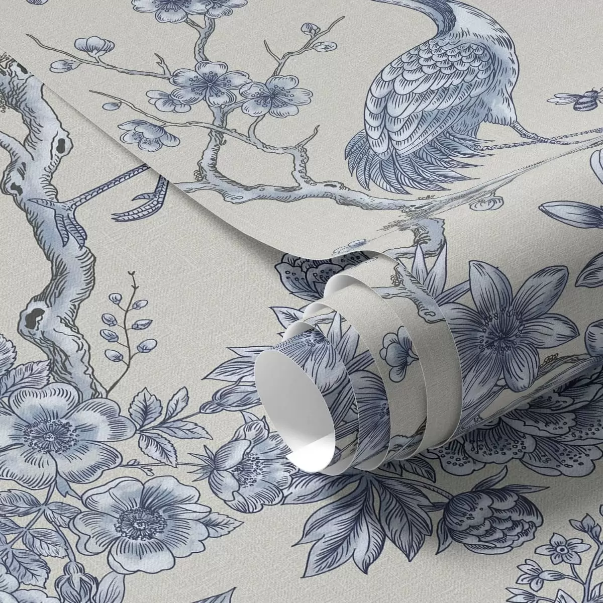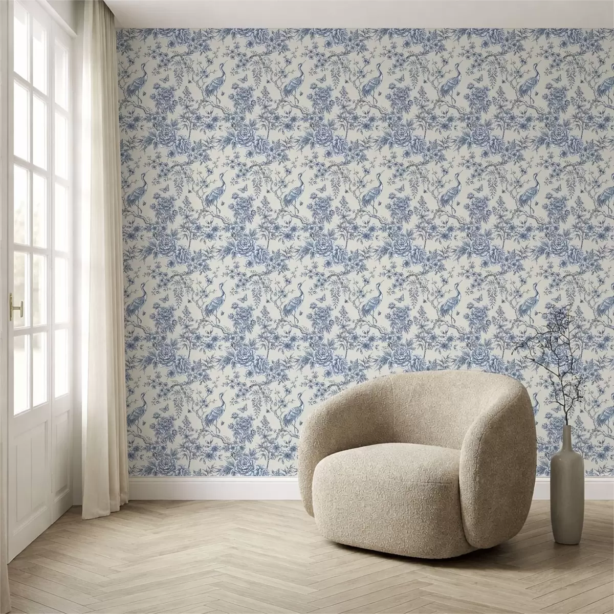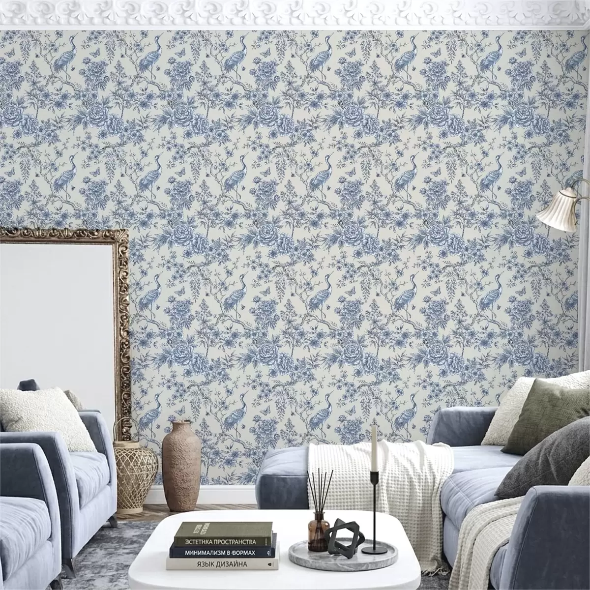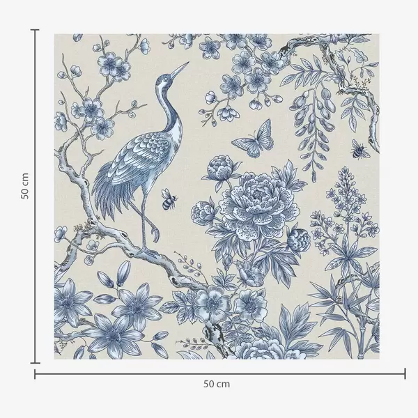 Papel tapiz Adorno floral azul con un pájaro y ramas Nr. a01132